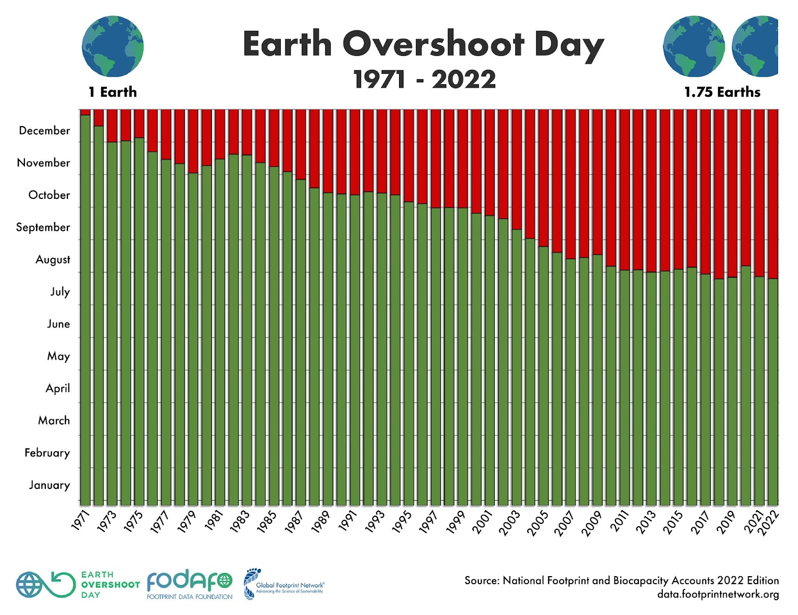 Khi mà nền văn minh nhân loại vẫn còn gắn với trái đất, thì số lượng hàng hóa được sản xuất bị giới hạn bởi tài nguyên mà trái đất có thể cung cấp. Trong hàng triệu năm tiến hóa của nhân loại, chúng ta là thế hệ đầu tiên chứng kiến thời điểm mà lượng tài nguyên trái đất tạo ra hàng năm không đáp ứng đủ nhu cầu sản xuất của con người. Thực vậy, ngày Trái đất quá tải (Earth overshoot day) được tính là ngày mà con người sử dụng hết tài nguyên mà trái đất có thể tái tạo trong một năm. Năm 1971, ngày overshoot đầu tiên rơi vào 25 tháng 12 và sau 50 năm, năm 2021, ngày này rơi vào 29 tháng 7. Với tốc độ tiêu thụ như hiện tại, chúng ta cần tới 1,6 Trái Đất để duy trì lối sống của mình. Do đó, nếu chúng ta tiếp tục duy trì thoái quen sản xuất và sinh hoạt như cách mà chúng ta đã làm từ thế kỉ trước thì chúng ta sẽ không thể để lại gì cho thế hệ sau ngoài một trái đất thiếu sức sống.